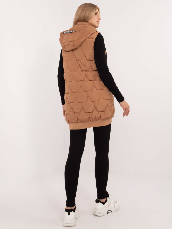 Pohodlná dámska vesta s kapucňou v camel farbe