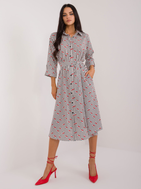 Objavte štýlové midi šaty, ktoré sú ideálnym spoločníkom na každodenné nosenie a do práce. Tieto rozšírené šaty s potlačou, s elegantným golierom a 3/4 rukávmi ponúkajú nielen pohodlie, ale aj šarm. Vďaka praktickým detailom, ako sú opasok a vrecká, sa stanú vašim obľúbeným kúskom.