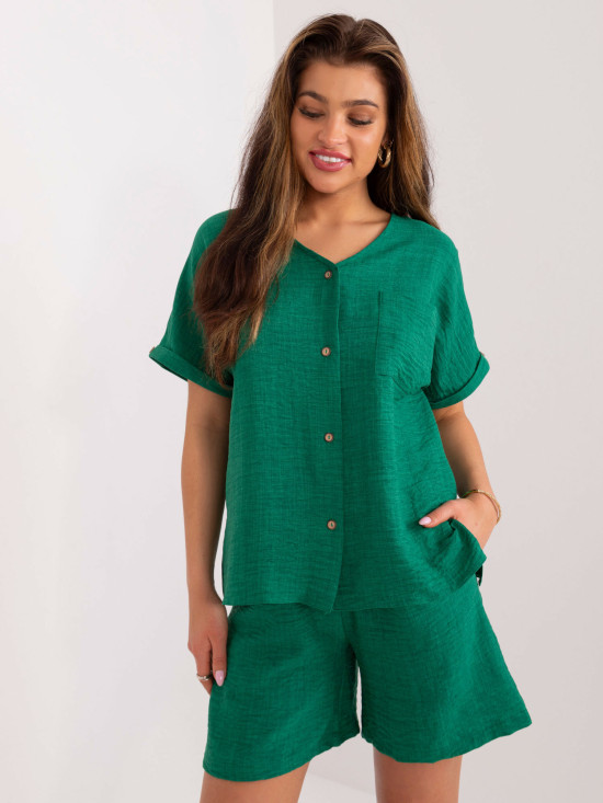 Objavte dokonalú kombináciu štýlu a pohodlia s týmto elegantným kompletom. Tento set, pozostávajúci z blúzky s krátkym rukávom a širokými šortkami, je ideálny na každodenné nosenie. Blúzka s V-dekoltom a hladkým vzorom sa skvele hodí na rôzne príležitosti, zatiaľ čo šortky s vysokým pásom a bočnými vreckami dodávajú celému outfitu praktickosť. Vyrobené z kvalitnej zmesi 50% bavlny a 50% polyesteru, tento komplet je nielen štýlový, ale aj pohodlný a ľahko sa udržiava. Pranie v práčke na 30 °C zabezpečuje jednoduchú starostlivosť. Modelka na obrázku má na sebe veľkosť S/M a jej rozmery sú: výška 173 cm, prsia 90 cm, pás 64 cm, boky 91 cm. Tento komplet je skvelou voľbou pre každú modernú ženu, ktorá hľadá kombináciu kvality a štýlu.